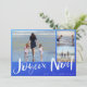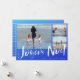 Joyeux Noel Cartão de Natal francês numa praia ombre azul inspirada em três design de fotos. Personalizado com três fotos e o nome da sua família. Este cartão de Natal de praia inverte-se para um design de stripe náutica azul e branca no verso.