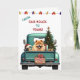 Um caminhão de picape azul teal carregar uma árvore de Natal decorada e pacotes de presentes na frente deste cartão de Natal bonito. Um lindo cachorro Chow Chow olha do portão. Um cartaz de madeira rústico na pára-choque diz "Feliz Natal". Na parte superior do cartão está uma série de luzes de Férias, e texto personalizado que diz atualmente "Da nossa casa para a sua". O dentro da placa tem mais campos de texto para personalização.