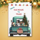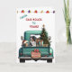 Um caminhão de picape azul teal carregar uma árvore de Natal decorada e pacotes de presentes na frente deste cartão de Natal bonito. Um lindo Cachorro da Montanha Bernese olha pelo rabo. Um cartaz de madeira rústico na pára-choque diz "Feliz Natal". Na parte superior do cartão está uma série de luzes de Férias, e texto personalizado que diz atualmente "Da nossa casa para a sua". O dentro da placa tem mais campos de texto para personalização.