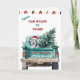 Um caminhão de picape azul téal carregar uma árvore de Natal cortada na frente deste cartão de Natal giro. Ao lado da árvore, está um cão Collie com barba envergonhada vestindo um chapéu de Papai Noel vermelho e branco. Na parte superior do cartão está uma série de luzes de Férias, e texto personalizado que diz atualmente "Da nossa casa para a sua". O dentro da placa tem mais campos de texto para personalização. Brilhante, divertido e colorido!