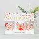 Um design de cartão com fotos de Natal moderno e bonito apresenta uma colagem de fotos com espaço para 3 fotos de sua família e uma tipografia química colorida que lê "Wishing You Holiday Cheer" durante todo o Ano Novo. Doce confetti pontas borda o texto para um design festivo alegre. Personalize o cartão com o nome da sua família e o ano. Clique no botão PERSONALIZAR TI para personalizar fontes, mover texto e criar seu design de cartão com fotos de feriado único.