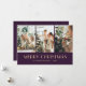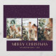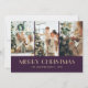 Foto roxa personalizada Cartão de Natal Merry com uma colagem fotográfica em fundo roxo escuro. Um padrão de neve nas costas. Personalize facilmente este cartão fotográfico de Natal com as suas fotografias e texto.