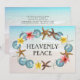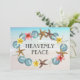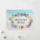 Cartão de Natal de praia com escritura. Cartões planos religiosos com texto personalizado para saudação, verso e assinatura. Amostra é: "Para nós, uma criança é nascer, para nós um filho é dado... e ele será chamado de maravilhoso conselheiro, poderoso Deus, eterno padre, príncipe da paz." O design de coroa na frente contém estrelas do mar, plumeria tropical/flores de frangipani e ornamentos de árvores azuis aqua.