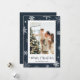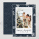 Cartão de Natal com flocos de neve azuis com flocos de neve sobre fundo azul escuro de neve. Personalize facilmente este cartão fotográfico de Natal com a sua fotografia e o seu nome familiar.