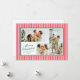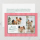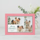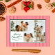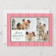 Pequenas faixas verticais, cor-de-rosa e vermelho-coral, dão a este cartão de três fotos uma vibração moderna e chic quando combinada com fontes clássicas em verde-floresta. O backer coordenado apresenta uma mensagem personalizada mais longa de alegria e atualização para o ano que é perfeito para enviar a amigos e familiares.