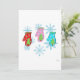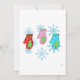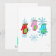 Estes cartões de Natal apresentam três cores de luvas de inverno, cada uma com uma árvore de Natal e pontos em um fundo branco com flocos de neve azuis.