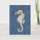 Um cavalo marinho vintage vestindo um chapéu de Papai Noel é colocado sobre um fundo rústico de conselhos de madeira coloridos de cobalto azul para fazer esta praia de excelente e o cartão de Natal do mar. O dentro é vazio para sua própria mensagem pessoal.