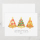 Ilustração de três fatias de pizza em forma de árvore de Natal encimadas por uma estrela. Personalize o nome e o ano.
