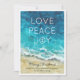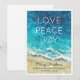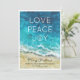 Cartões de natal quentes e temerários da praia tropical apresentando uma bela pintura aquarela de areia ouro e o oceano azul aqua, as palavras 'amor, paz, alegria', cumprimentos das suas estações e nome da família.