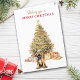 Na frente deste cartão de Natal, um adorável cachorrinho Boxer fica em frente a uma árvore de Natal. A árvore é decorada em ouro, e pacotes de presentes correspondentes estão embaixo dela. O texto vermelho e dourado diz "Desejando-lhe um NATAL MERRY". Campos de texto dentro que você pode personalizar para qualquer coisa que quiser. Certifique-se de ver os outros cartões temáticos e presentes do cão Boxer na nossa loja.