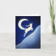 Cartão de Natal de inverno. Rena branca voando sobre uma colina coberta de neve com uma lua crescente ao fundo. Em branco no interior. Ótimo para votos de Natal, saudações de inverno ou apenas para enviar aos amantes de animais!