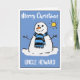 Cartão de Natal para um tio. Cartão de Natal divertido com um boneco de neve num dia ensolarado de inverno.