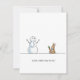 Alegrar a temporada de férias de alguém com este cartão de Natal do boneco de neve confrontando o coelho. O coelhinho adorável e o boneco de neve expressivo criam o momento cômico perfeito. Ideal para enviar, presentear ou adicionar à sua coleção de Natal, este cartão traz risadas, charme e espírito festivo.