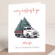 Um cartão de Natal festivo de 5x7 dobrado com a alegre mensagem “Feliz Natal para você” em tipografia moderna manuscrita vermelha, combinada com um gráfico vintage de um caminhão de entrega de árvore de Natal. Criado em um fundo branco limpo, este cartão de Natal elegante e retrô combina charme nostálgico com um layout minimalista moderno. Personalize a seção “com amor de” e abaixo com o nome da sua família em tipografia complementar para um toque caloroso e personalizado. Perfeito para compartilhar amor e votos de Natal, este design clássico e divertido não fotográfico adiciona personalidade à temporada enquanto espalha alegria festiva. Um design de Natal atemporal ideal para famílias, indivíduos e casais.
