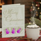 A frente deste cartão de Natal apresenta um padrão de árvore bege suave com pinhas cor-de-rosa brilhantes com laços e estrelas, todos desenhados à mão. O interior oferece espaço para adicionar quatro fotos pessoais e uma mensagem personalizada. Perfeito para quem ama um toque lúdico na tradição.