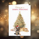 Na frente deste cartão de Natal, um adorável filhote de German shepherd veste um chapéu de Papai Noel vermelho e branco e fica em frente a uma árvore de Natal. A árvore é decorada em ouro, e pacotes de presentes correspondentes estão embaixo dela. O texto vermelho e dourado diz "Desejando-lhe um NATAL MERRY". Campos de texto dentro que você pode personalizar para qualquer coisa que quiser. Certifique-se de ver os outros cartões temidos e presentes do GSD em nossa loja.
