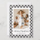 Foto de xadrez de búfalos brancos e pretos Festivos Cartão de Natal Feliz, com neve caindo e estrelas sobre um fundo de xadrez de búfalos na frente e um fundo de xadrez de búfalos preto e branco na parte de trás.