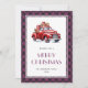 Xadrez de búfalos roxos Cartão de Natal Merry com um caminhão vermelho clássico. Personalize facilmente este cartão de feriado com aquarela com o seu nome de família e o ano.