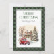 Caminhão vermelho de água Cartão de Natal Merry com cenário de inverno e um caminhão vermelho dentro um quadro de xadrez de búfalo verde.