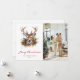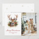Foto em aquarela Cartão de Natal Merry, com cerco de cervo por decoração de Natal de galhos de pinheiro, Enfeites de natal holly e vermelha e um desejo de feriado em uma letra elegante na frente e flocos de neve no verso. Personalize facilmente este cartão festivo de férias com a sua fotografia e o seu texto.