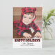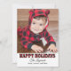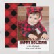 O cartão de foto moderno "Férias Felizes" inclui um grande espaço para foto e texto preto que pode ser personalizado. Apresenta um padrão xadrez rústico vermelho e preto de búfalo na frente e no verso do cartão com neve falsa.
