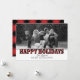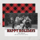 Cartão de foto moderno "Férias Felizes" inclui um grande espaço para foto e texto preto que pode ser personalizado. Apresenta um padrão xadrez de búfalo rústico vermelho e preto na frente e no verso do cartão com neve falsa e filtro preto e branco. <i>Fotografia © Storytree Studios, Stanford, CA</i>