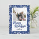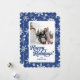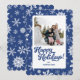 Este cartão de férias de foto apresenta um fundo azul escuro e um padrão de flocos de neve único. Uma fonte cursiva ousada une o design. Adicione suas fotos e saudações para torná-lo exclusivamente seu!