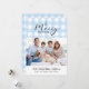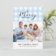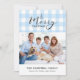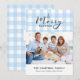 Gingham azul-claro clássico com saudação de Feliz Natal. Espaço para 1 foto horizontal e mensagem pessoal na frente, e o ano no lado traseiro correspondente.