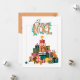 Um cartão de coração aquecedor para Cartões de natal com animais bonitos e uma montanha de presentes.