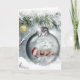 Este cartão de Natal apresenta um bebê doce vestindo um chapéu de Papai Noel dentro a bauble em uma árvore na floresta coberta de neve.
