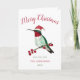 Cartão de Natal personalizado bonito com um beija-flor arruinado vestindo um chapéu de Papai Noel em fundo branco. Apenas adicione seu nome. A mensagem dentro, o tamanho e a cor da fonte podem ser alterados clicando em "Editar usando a ferramenta design".