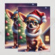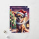 Este cartão de saudação festivo mostra uma foto de um chihuahua vestindo um chapéu de Papai Noel e sentado em frente a uma árvore de Natal. Os grandes olhos castanhos do cão e a cauda ondulada certamente põem um sorriso no rosto do receptor.