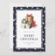Azul elegante Cartão Feliz de Natal com neve caindo, estrelas e dons de Natal a aquarelas sobre fundo azul. Personalize facilmente este cartão azul de feriado com aquarela com o seu nome familiar.