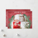 Uma coroa de galhos de pinheiros, bagas e folhas em um fundo vermelho de cordulagem rodeia sua foto favorita com sua saudação em letras quentes na frente e sua personalização e mensagem nas costas. Selecione Matte para o papel mais pesado e alta definição para melhor qualidade de impressão. *Use uma foto horizontal.