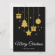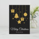 Feliz Natal em uma fonte de caligrafia elegante com árvore de Natal pendurada, presentes, estrela e desenho de esfera de Natal. Este cartão de Natal de cor preta é projetado para que você possa alterar a cor do fundo e também inserir o nome da sua família ou removê-lo se desejar ter apenas o design sem a linha do sobrenome.
