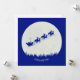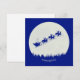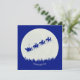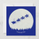 Um design azul e branco do Papai Noel e suas renas voando sobre uma floresta arborizada com uma lua gigante ao fundo. Na parte inferior, o texto diz "Saudações de Fim de Ano". Sinta-se à vontade para escrever no verso!