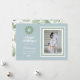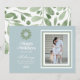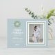 Celebre a temporada de festas com esses elegantes acentos de verde em aquarela e azul. Este design apresenta um monograma personalizado em uma grinalda de aquarela verde com a opção de adicionar sua mensagem pessoal e foto.