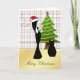 Cartão de Natal sofisticado com mulher e vestido noturno com gato na frente da árvore de Natal