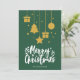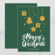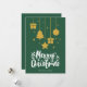 Feliz Natal em verde num tipo de letra decorativo sofisticado em branco pendurado no design de ícones de Natal. Este cartão de Natal com cor de fundo verde é projetado para que você possa alterar a cor do fundo e também inserir o nome da sua família ou removê-lo se desejar ter apenas o design sem o texto. Você também pode personalizar a cor das palavras "Feliz Natal" se desejar.