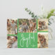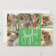 Cartões de natal de Natal com fotos múltiplas apresentam seus nomes e a palavra Joyful em letras quentes em um fundo verde. Basta carregar as suas fotos familiares favoritas e adicionar a sua personalização familiar atrás. Selecione Matte para o papel mais pesado e High Definition para obter a melhor qualidade de foto.