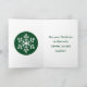 A frente tem um floco de neve branco sobre um fundo verde escuro com "Feliz Natal" da família ao seu redor. O dentro tem uma repetição do floco de neve e uma mensagem em verde correspondente.