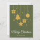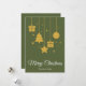 Feliz Natal em uma fonte de caligrafia elegante com árvore de Natal pendurada, presentes, estrela e desenho de esfera de Natal. Este cartão de Natal de cor verde oliva escuro é projetado para que você possa alterar a cor do fundo e também inserir o nome da sua família ou removê-lo se desejar ter apenas o design sem a linha do sobrenome.