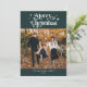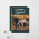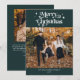 Cartão de férias retrô e minimalista para 2023 com fontes retrô com espirais que dizem "Feliz Natal" no topo com estrelas. Você pode adicionar 2 fotos a este cartão. O fundo é verde floresta.