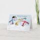 Três felizes famílias de neve vestindo lenços e chapéus coloridos e desejando a todos um Feliz Natal.