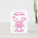 Cartão de Páscoa de coelho rosa e giro. A mensagem deve ser personalizada de acordo com as suas necessidades pessoais. © Arte gráfica original por Sarah Trett.