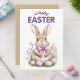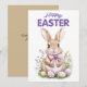 Celebre a Páscoa com uma elegância suave e charme atemporal com este lindo cartão de cumprimentos de coelho em aquarela. Com uma ilustração de um coelho doce acentuada com delicadas flores de primavera e ovos de Páscoa em tons pastel, este design é realçado por tons suaves de rosa e roxo e letras graciosas.