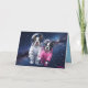 Um cartão do dia de São Valentim com um casal de Boston Terrier em um disco voador indo para a lua.