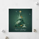 Um cartão de Natal elegante e na moda, com uma árvore geométrica abstrato, feito de formas triangulares num gradiente de verde esmeralda, sábio e ouro metálico. Linhas negras e flocos de neve minimalistas em fundo branco acrescentam um toque contemporâneo. O elegante texto sans-serif 'Saudações da Estação' completa este cartão de feriado design.