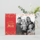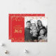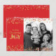 Confete vermelho, branco e dourado com espaço para uma foto e texto que diz "Enviando Alegria de Natal". Sobreposição de Confetti estende-se à área de fotos. Este design parece excelente com um tom de sépia ou uma foto em preto e branco.