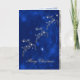 Elegante cartão de saudação de Natal, com gráficos de renas de tom prateado feitos de estrelas, contra fundo azul escuro, com flocos de neve e faíscas. Uma banda decorativa de tom prateado, corre pela borda direita da placa. Personalize o texto, dentro e saia, para atender às suas necessidades de feriado.